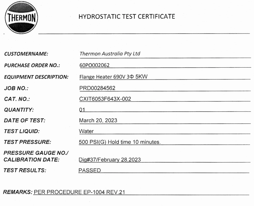 Báo cáo thử nghiệm áp suất thủy tĩnh và ATEX của bộ gia nhiệt Caloritech